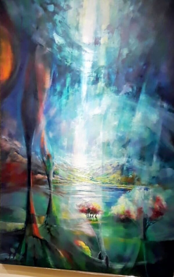Titel: Reïncarnatie in beeld. Werkwijze: Acryl op linnen. Formaat: 60x90cm. Verkocht. Titel: Reïncarnatie in beeld. Werkwijze: Acryl op linnen. Formaat: 60x90cm. Verkocht. Titel: Gelaagdheid. Werkwijze: Acryl op linnen. Formaat: 220x70cm. Verkocht.Titel: De zon warmt de aarde, kleurt via bloemen onze geest. Formaat: 80×60 cm. Werkwijze: Acryl op doek. Verkocht.Titel: Hemel en aarde in gesprek. Formaat: 100×160 cm. Vraagprijs: 1750,-.
